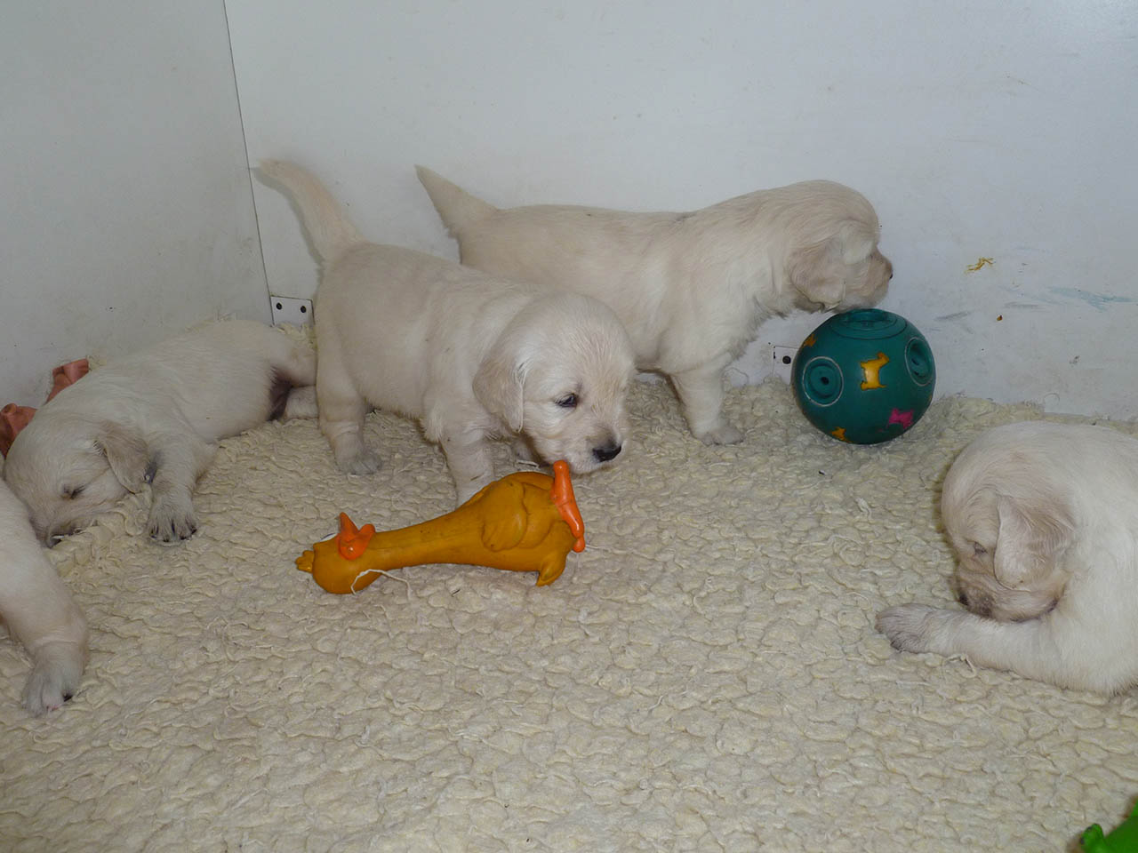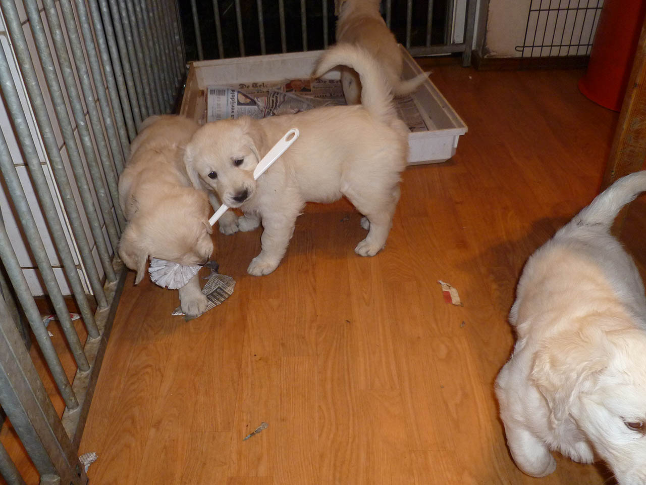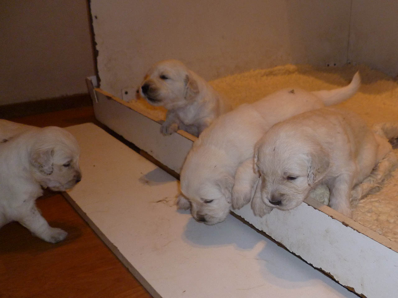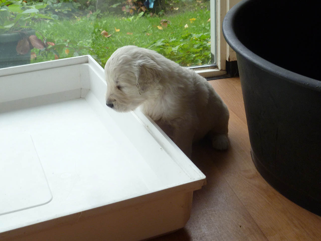 De pups zijn nu 3 ½ week oud en gaan steeds meer ontdekken.