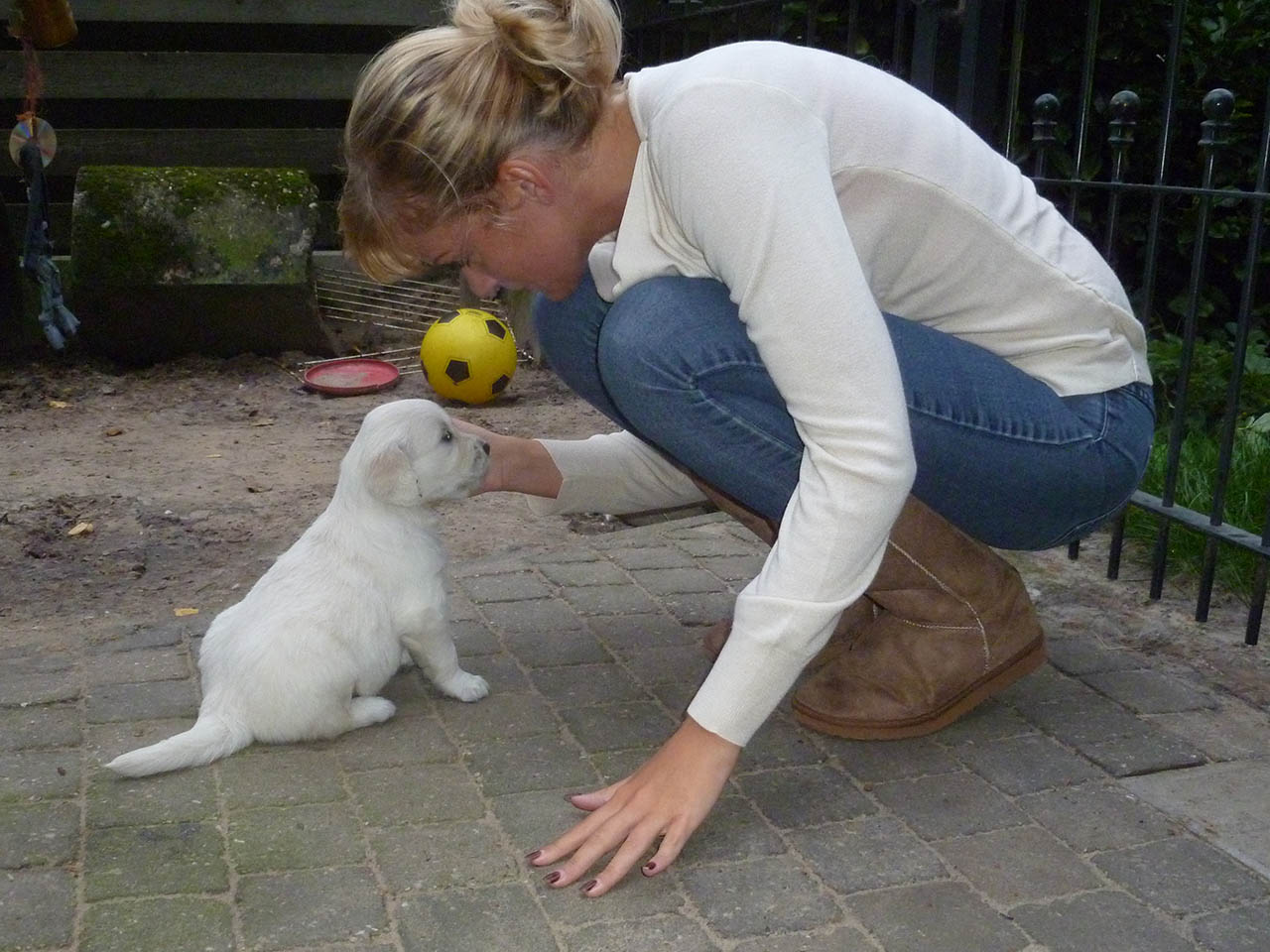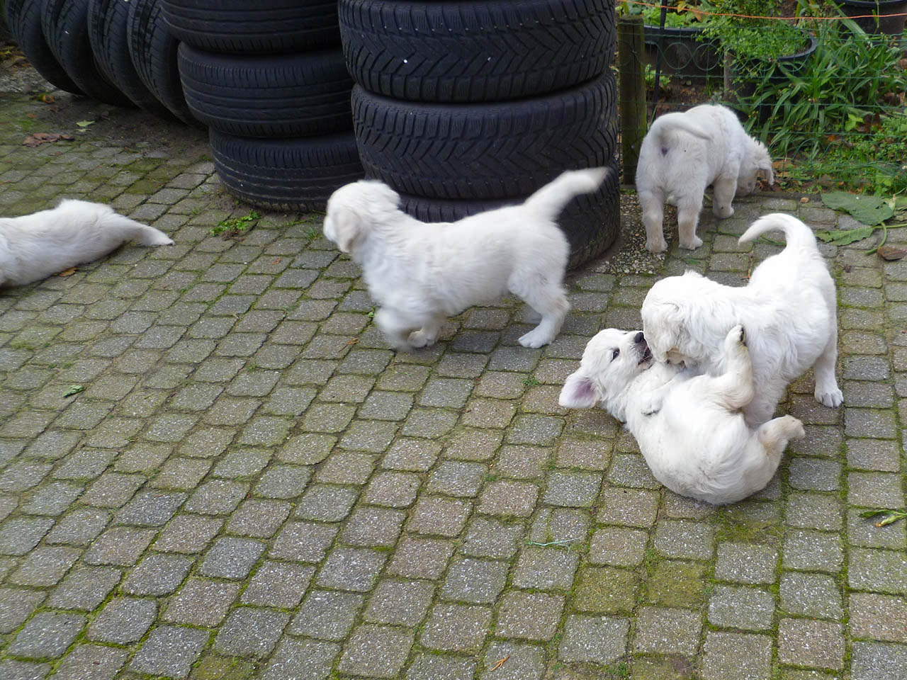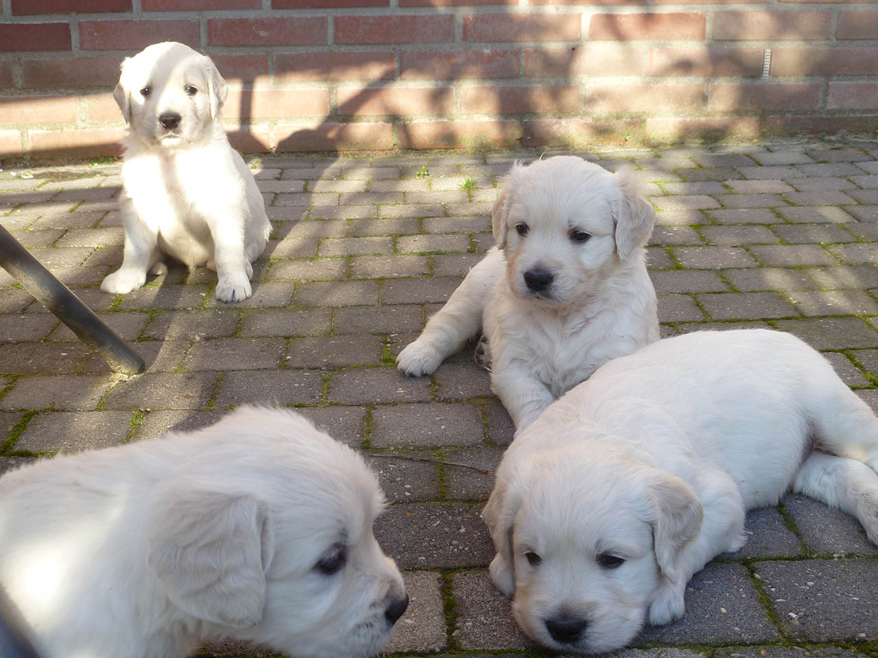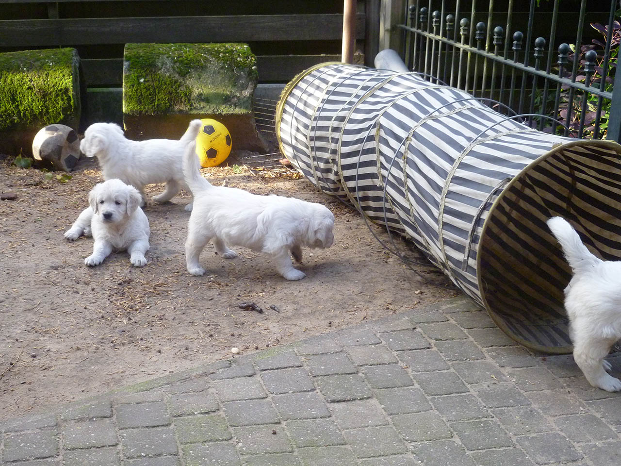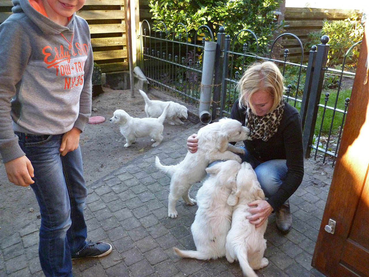 De pups zijn nu ruim 4 week oud; ze lopen steeds meer buiten en krijgen veel bezoek.