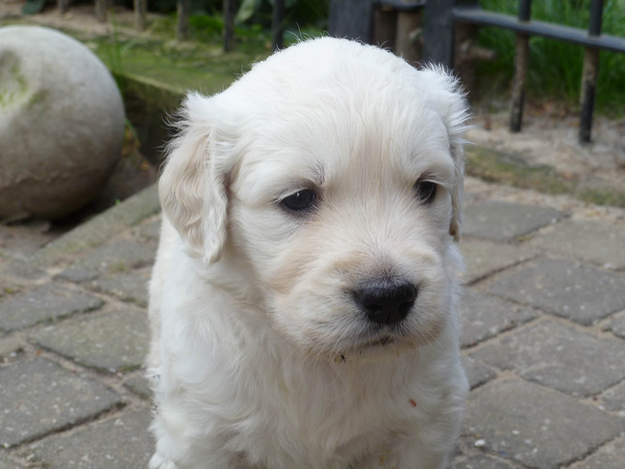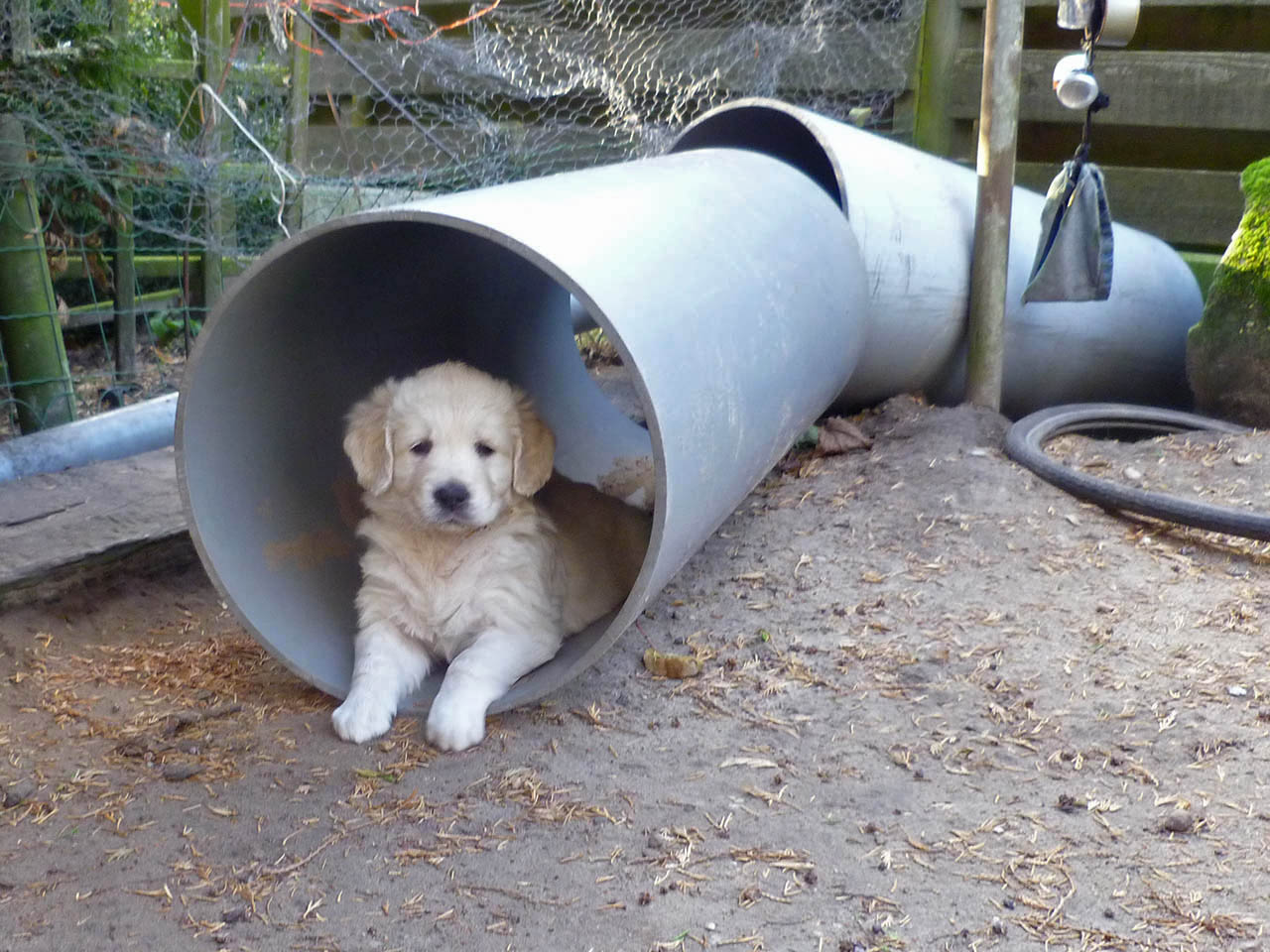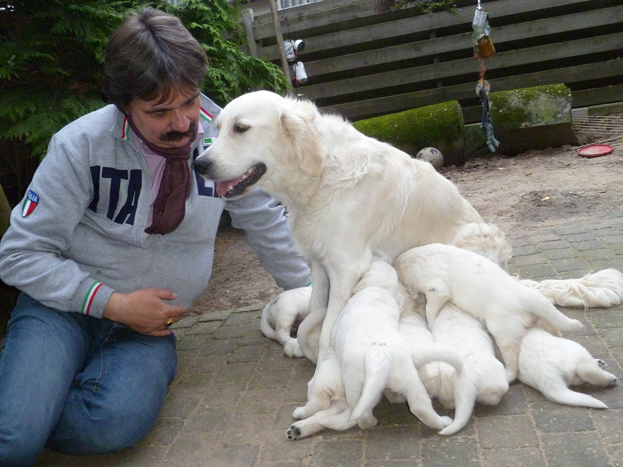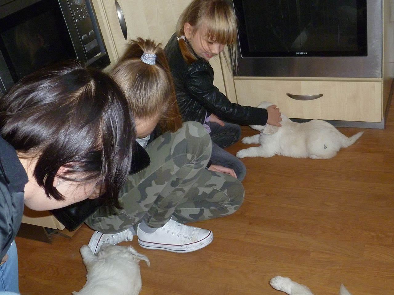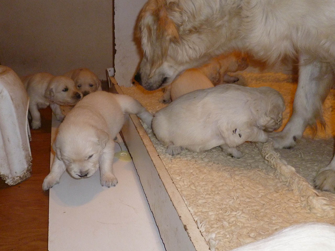 De pups zijn nu ruim 4 week oud; ze lopen steeds meer buiten en krijgen veel bezoek.
