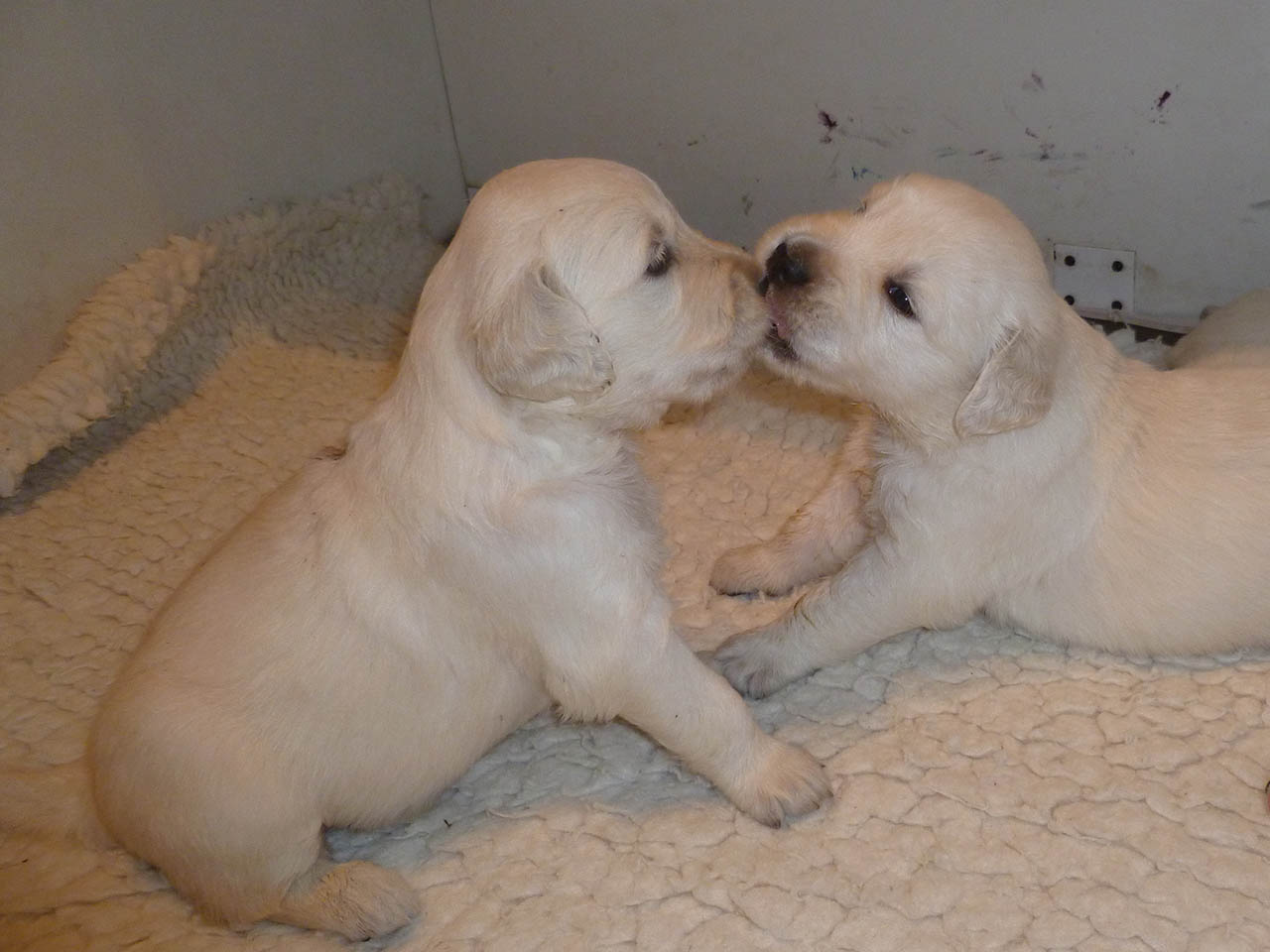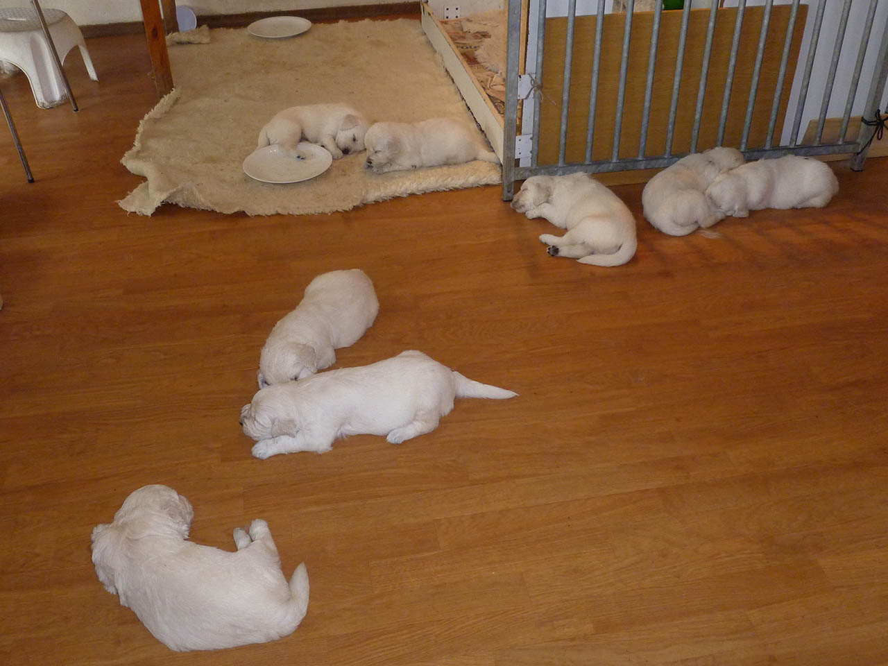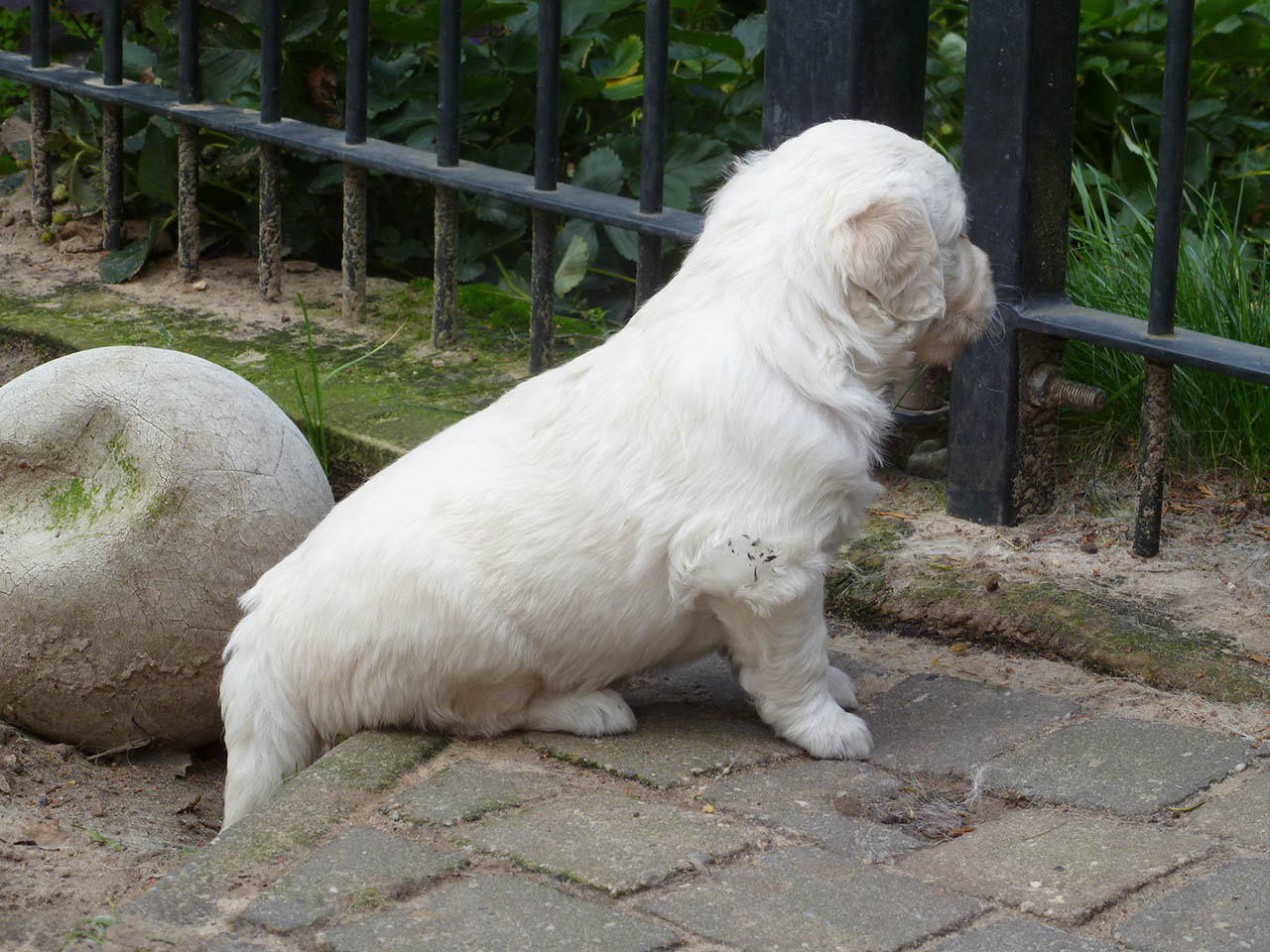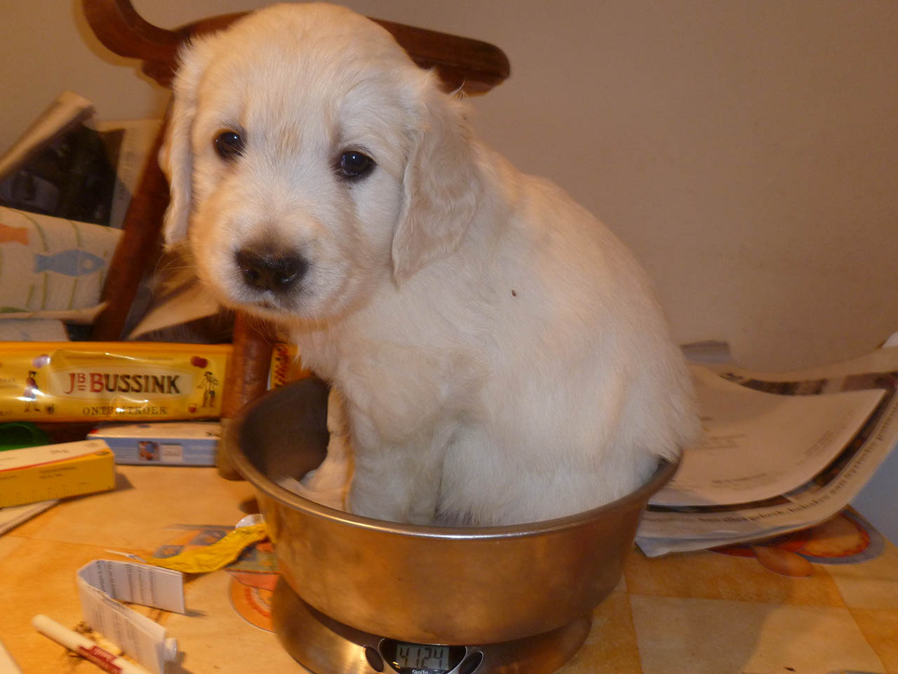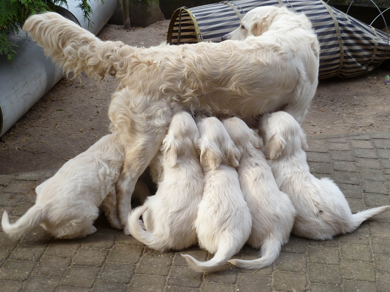 De pups zijn nu ruim 4 week oud; ze lopen steeds meer buiten en krijgen veel bezoek.