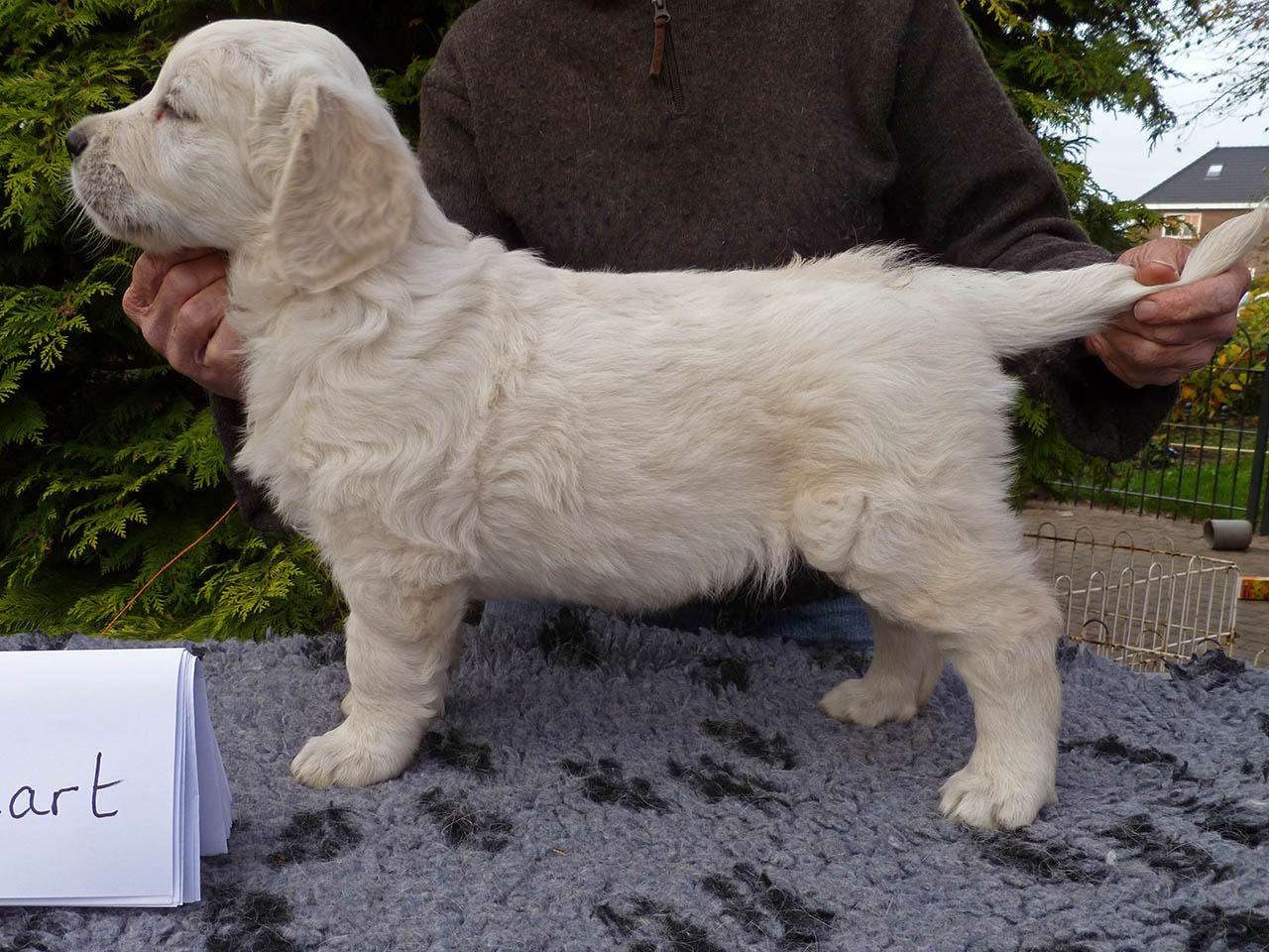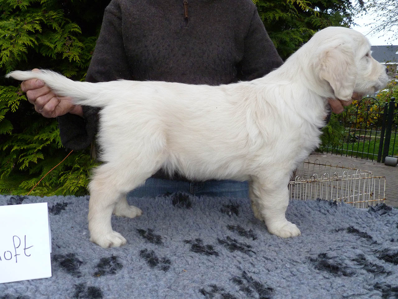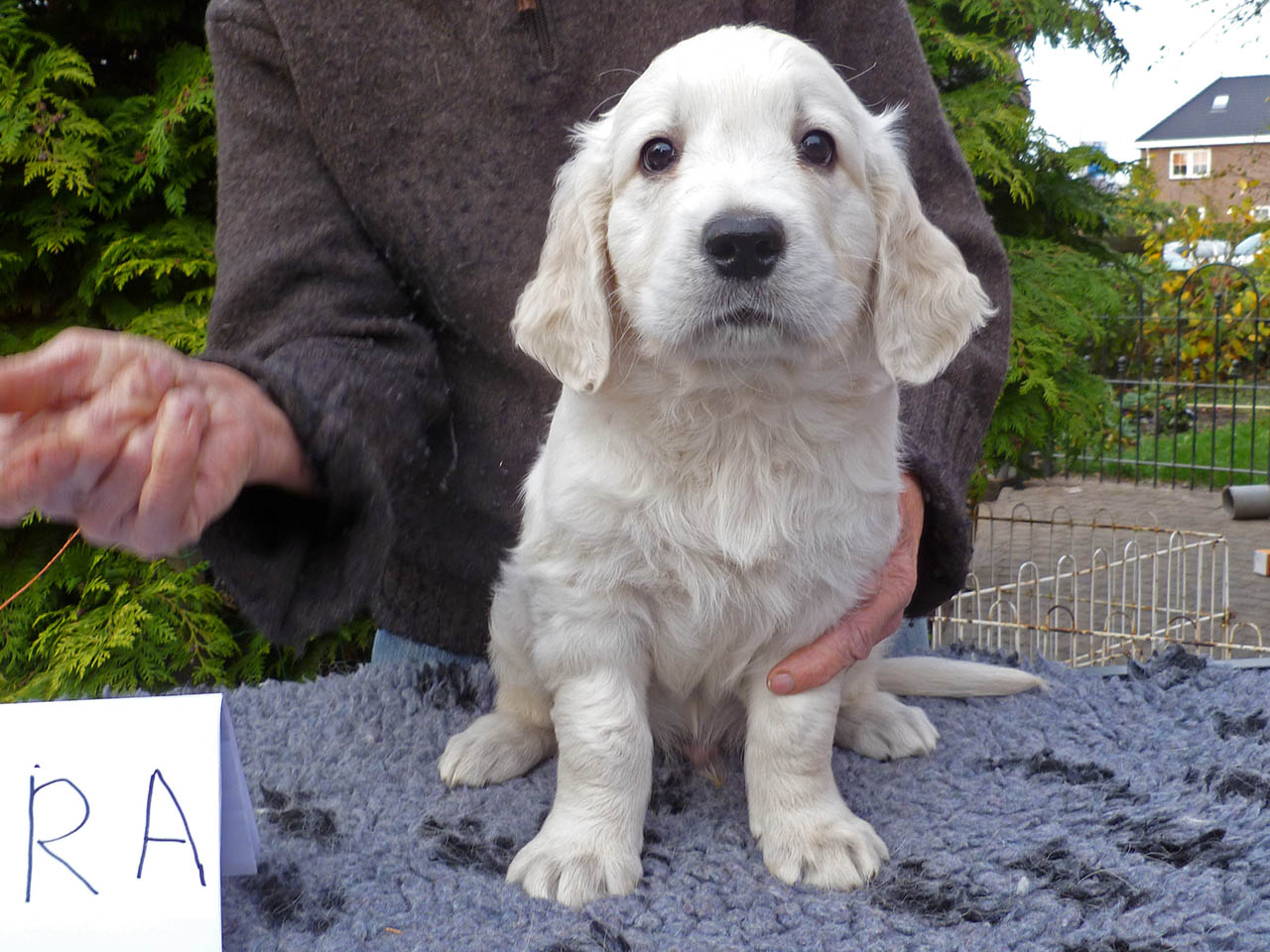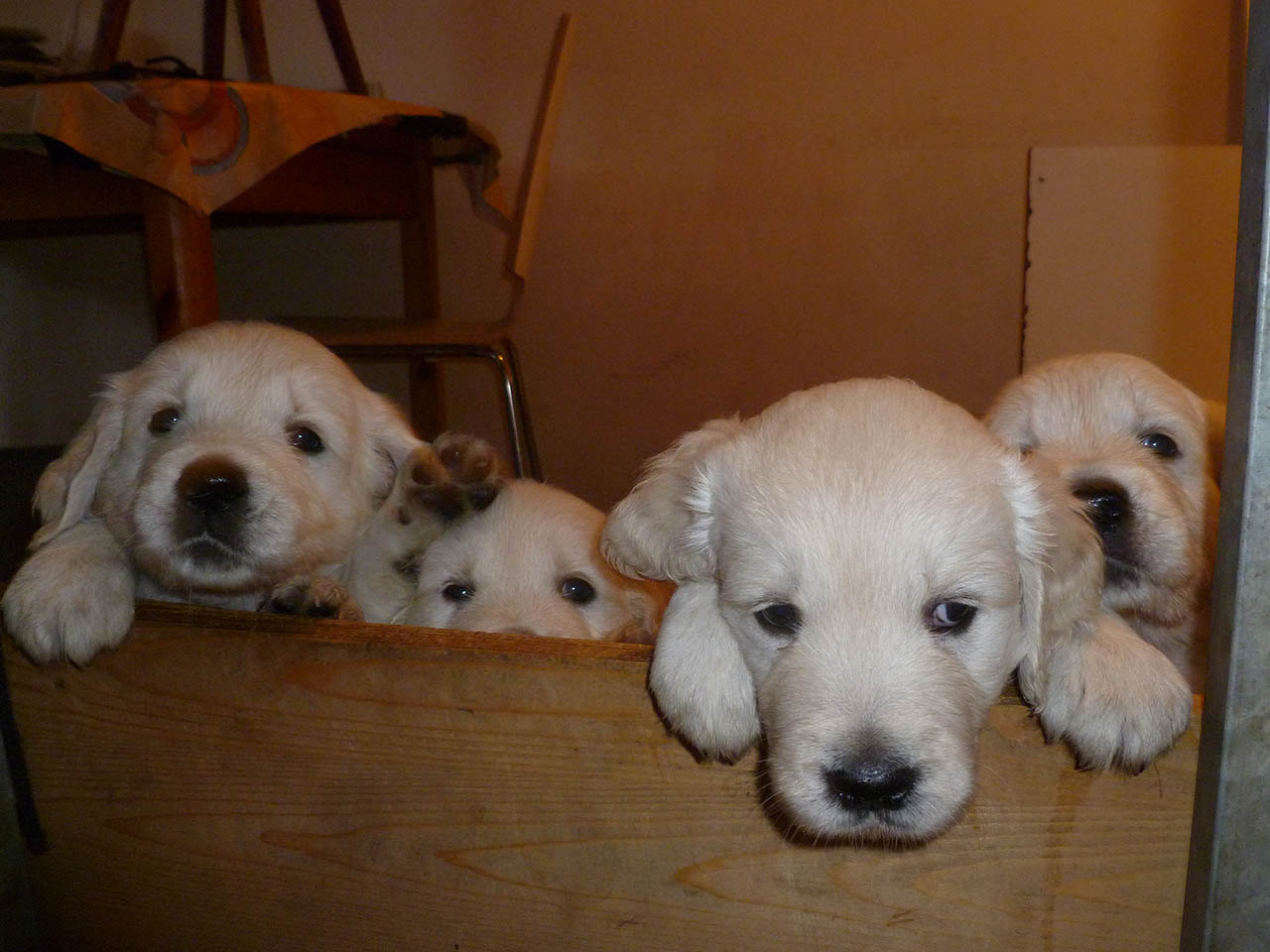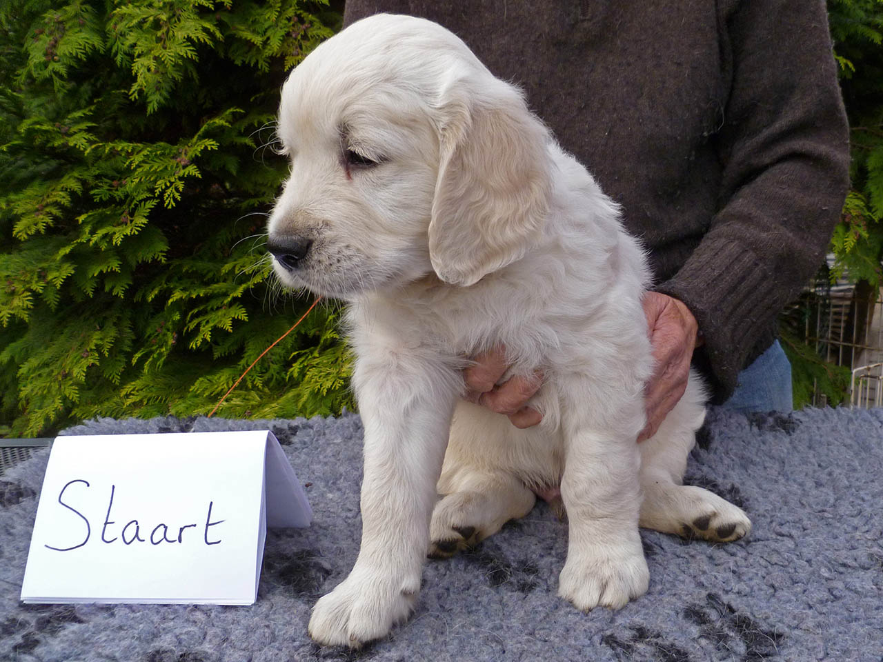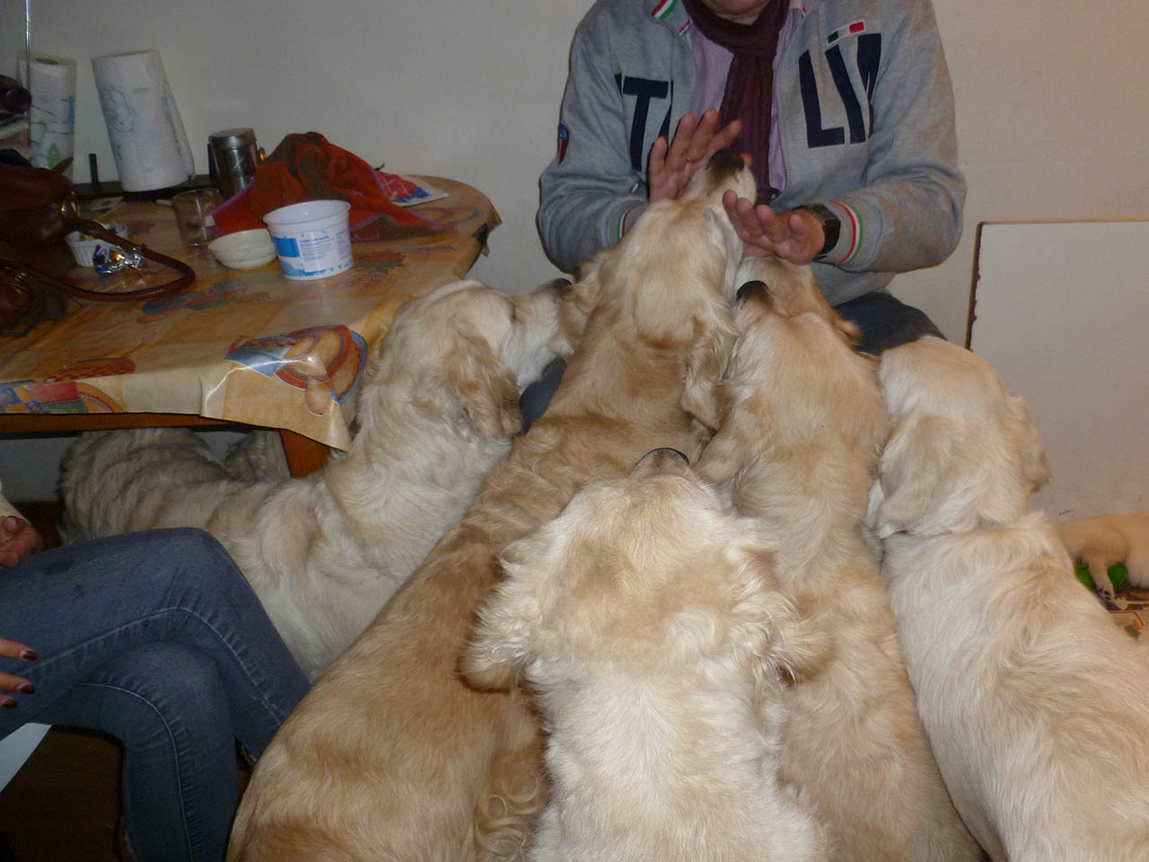 De pups zijn nu ruim 4 week oud; ze lopen steeds meer buiten en krijgen veel bezoek.