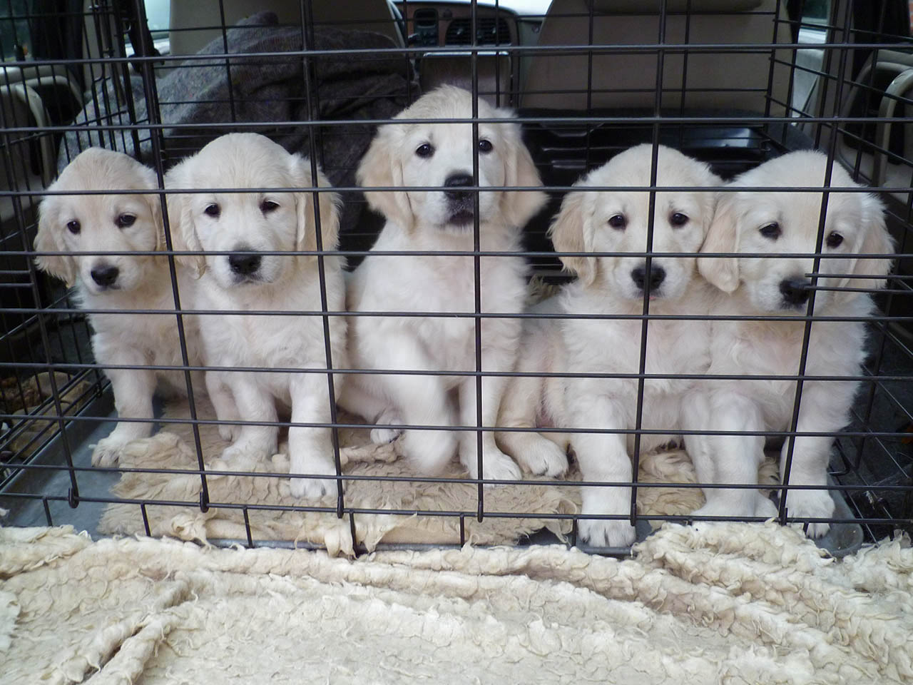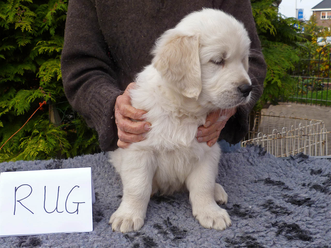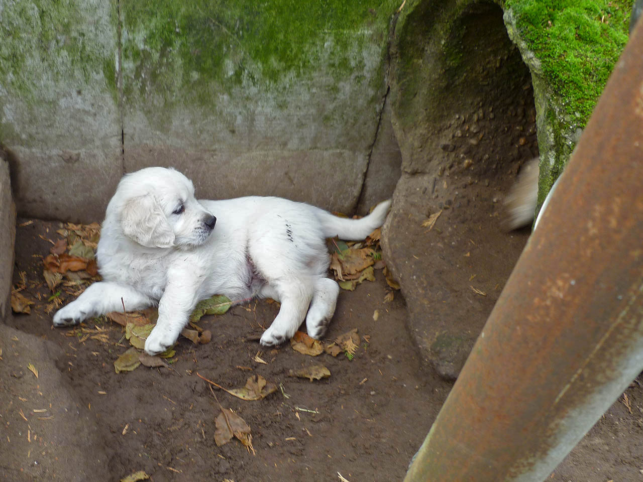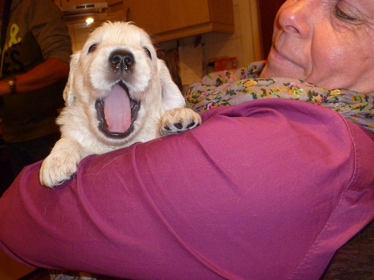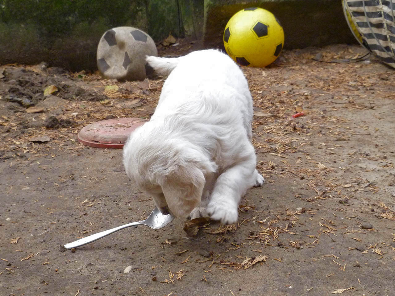 De pups zijn nu ruim 4 week oud; ze lopen steeds meer buiten en krijgen veel bezoek.
