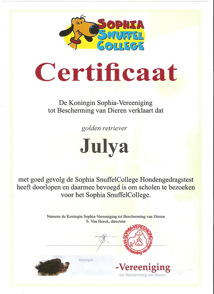 Julya is geslaagd voor de Sophia Snuffel College hondengedragstest (www.sophiasnuffelcollege.nl )